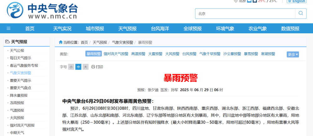 中央气象台6月29日6时发布暴雨黄色预警: 预计,6月29日8时至30日8时,四川盆地、甘肃东南部、陕西西南部、重庆西部、湖北东部、浙江西部、福建西北部、安徽北部、江苏北部、山东北部和南部、河北东南部、辽宁东部等地部分地区有大到暴雨,其中,四川盆地中部等地部分地区有大暴雨,局地特大暴雨(250~300毫米)。上述部分地区伴有短时强降水(最大小时降雨量30~50毫米,局地可超过80毫米),局地有雷暴大风等强对流天气。