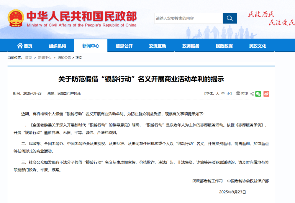 民政部发布关于防范假借“银龄行动”名义开展商业活动牟利的提示
