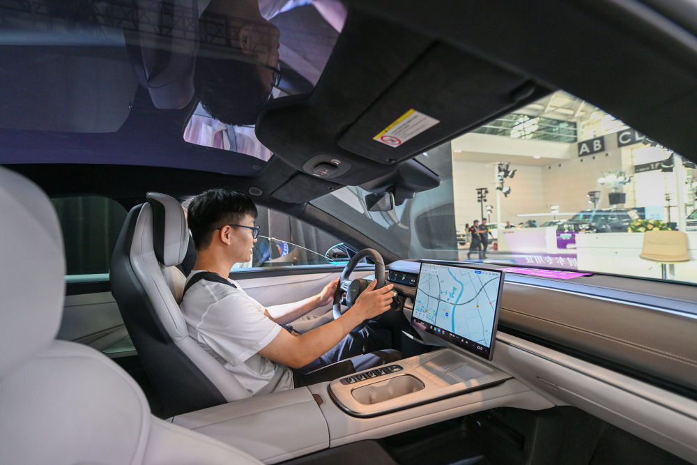 观众在展会现场静态体验一款智能网联电动汽车。新华社记者 孙凡越 摄