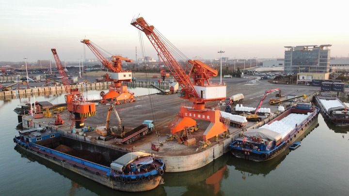 这是2025年1月7日拍摄的周口中心港范营作业区。新华社发 (刘俊涛摄) “看中周口港的水运优势,我们在附近投资50多亿元建设了占地2000多亩的益海嘉里(周口)现代食品产业园。”产业园负责人韩霞给记者算了一笔账,与铁路相比,进口大豆到连云港直接装船走水路到周口港,每吨省运费约20元。按一年进口80多万吨大豆计算,如果一半走水路,一年可节约运费800多万元。 周口港已开通24条国内集装箱航线和19条国际水运通道,串起国内国际两个市场、两种资源。“下一步我们将以畅通道、强枢纽、优服务、提智能、促绿色为主线,发展多式联运,培育壮大枢纽经济,深度融入长三角港口群,更好服务全国统一大市场建设。”周口临港开发区党工委书记邓昌锋说。