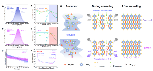 钙钛矿太阳能电池作为一种新型光伏技术,其光电效率在过去十多年里从最初的3.8%迅速提升至26%以上,但距离其理论极限仍有差距。要实现高效率,制备高质量的钙钛矿薄膜是关键。 在该研究中,研究人员制备的钙钛矿薄膜质量得到显著提升:载流子寿命延长至20微秒,界面缺陷密度大幅降低。基于该薄膜所研制的太阳能电池经多家权威机构认证,实现了27.2%的光电转换效率。在稳定性方面,电池在持续运行1529小时后,仍能保持初始效率的86.3%;在85℃光热耦合加速老化条件下运行1000小时后,也维持了82.8%的初始效率。 |