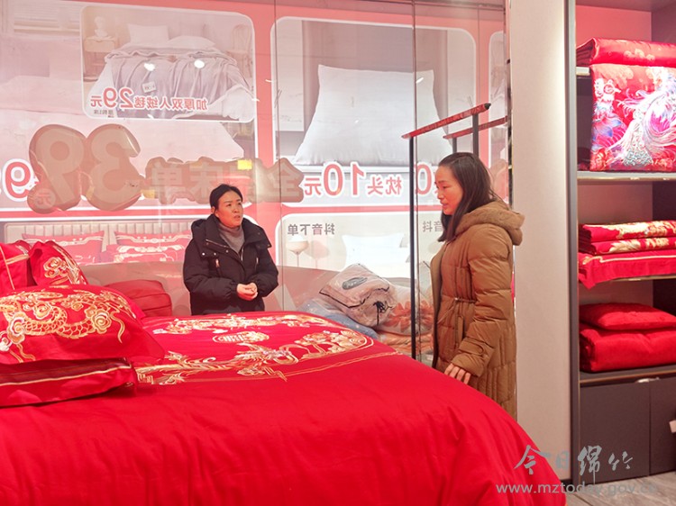而在大西街的一家纺店内,婚庆床品款式丰富多样,不仅有经典大气的“福禄迎喜”主题款,还有简约时尚的纯色提花设计,更有巧妙融合国潮元素与当代美学的创新款式,这些琳琅满目的婚庆床品,充分满足了消费者的个性化需求。“临近春节,结婚和搬家的人比较多,我们的销售跟去年同期相比增加了20%。”店铺老板王建华说。 为激发市民消费热情,商家还推出了“暖冬特惠”“满减折扣”等促销活动,进一步助推了销售热潮。“我们今年销售得比较好的就是价格在200元到600元之间的四件套,和价格在100元到300元之间的被芯。”店铺负责人黄应琼告诉记者,今年还新增了抗菌除螨、防静电等工艺融入被芯,在触感上也有了显著改善,给顾客带来更加舒适的感受。 |