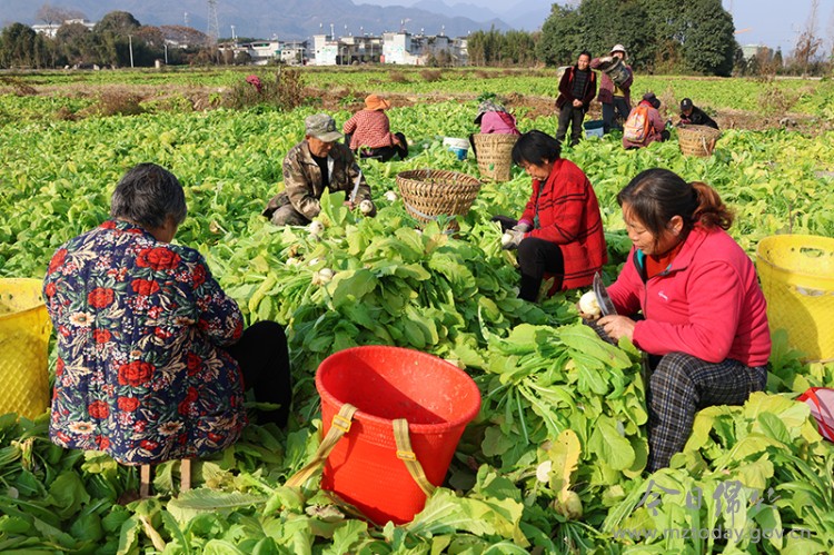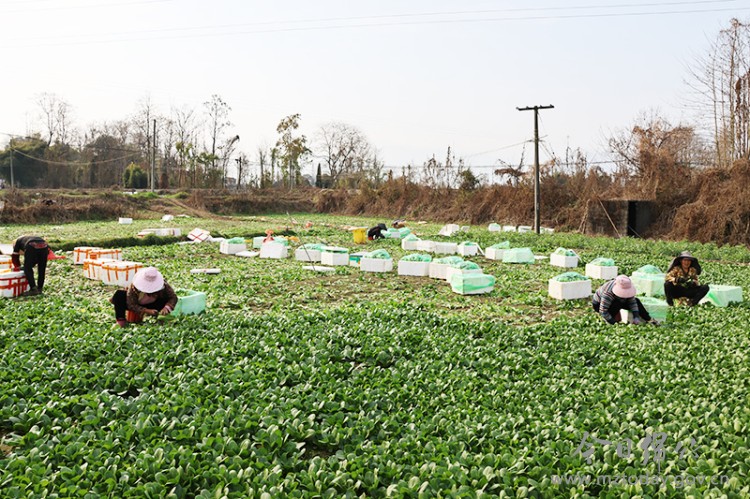 1月16日,在该镇红旗村的蔬菜种植基地里,成片的上海青翠绿欲滴,长势喜人。几十位村民分散在田间,麻利地采收、码放、装车,一派繁忙的丰收景象。 “现在种菜,心里踏实得很!”在红旗村供销社田间管理人员黄应兵的身后,一箱箱打包装好的上海青被搬上冷链运输车,即将发往千里之外。“我们种了1300多亩,有九成是发往省外大型商超和批发市场,本地市场只占一成,根本不愁卖。”黄应兵告诉记者,“订单农业”让他们告别了“看天吃饭、随行就市”的担忧,只需专注于把菜种好、种优就行了。 从“田间”到“车间”:订单串起产业链