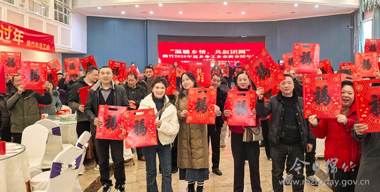 2月10日上午,市人社局、市总工会与中国邮政绵竹市分公司联合举行了“温暖乡情·共叙团圆”2026年返乡务工乡亲新春团年饭活动。132名外出务工返乡农民工代表欢聚一堂,在团圆宴的热烈气氛中,共话乡情、共谋发展。