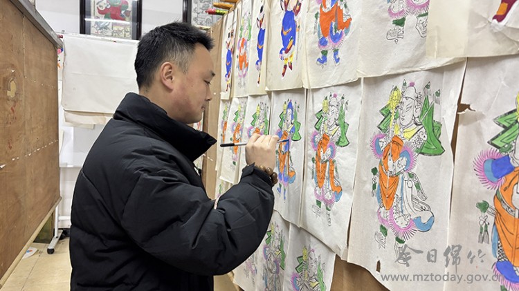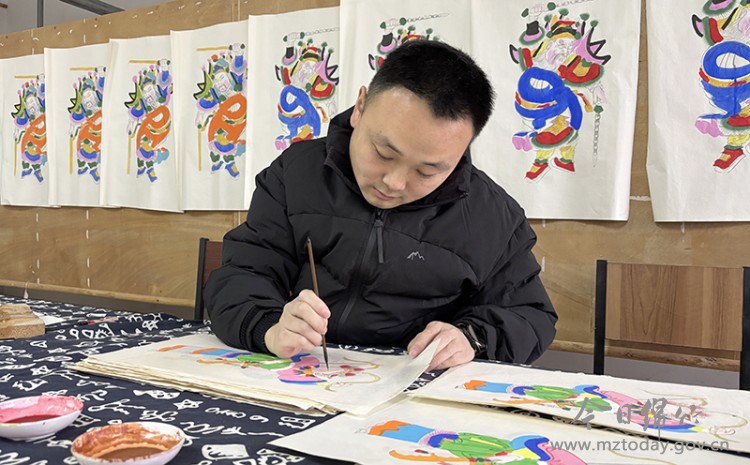 绵竹木版年画工序繁琐、耗时耗力,从选木、刻版、拓印到填色,每一步都容不得半点敷衍。老一辈艺人半蹲马步绘年画、沉心聚力雕木版的身影,深深扎根在他心中,也成为他多年来坚守的动力。为了夯实基本功,他沉下心来,用5年时间反复练习蹲马步、雕刻木版,把每一个基础动作练到极致,只为传承好祖辈留下的技艺。 在爷爷的悉心教导和自身的刻苦钻研下,李德敬不仅熟练掌握了绵竹年画“明展明挂”“填水脚”等独特技法,更练就了独具特色的“鸳鸯笔”技法,逐渐形成了笔锋奔放雄健、色彩明艳饱满、线条质朴粗犷的绵竹年画北派风格,成为业内认可的青年传承人。 在创新里前行 为绵竹年画注入时代活力 坚守传统,更要与时俱进。走进岷元阁年画社,墙上密密匝匝裱好的年画,诉说着这门技艺的传承与新生。这里不仅有《双扬鞭》《赵公镇宅》等流传百年的传统门神经典,承载着一代人的民俗记忆;还有融入三星堆、大熊猫等四川特色元素的文创年画,让非遗与地域文化深度融合;也有可供收藏的大幅屏画,工艺精湛、极具艺术价值;更有适合日常佩戴、摆放的年画书签、冰箱贴、摆件等小巧物件,让绵竹年画走进寻常百姓家,成为可触可感的文化符号。