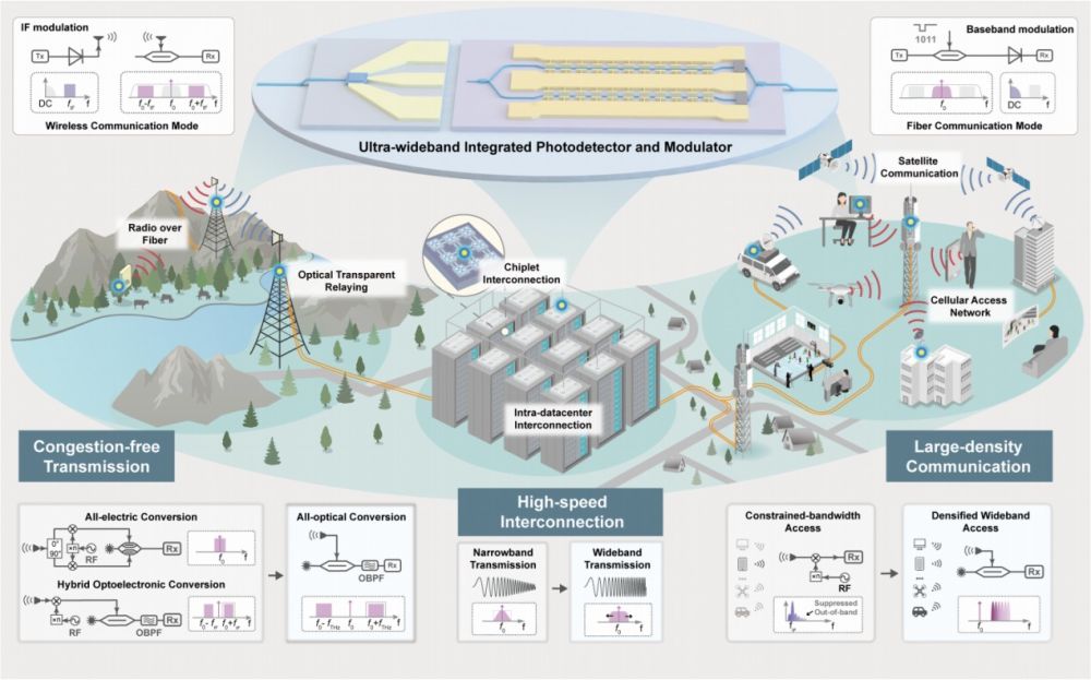我国科学家近日在光通信和6G领域取得突破性进展,在国际上率先实现光纤通信和无线通信系统间的跨网络融合,自主研发的“光纤—无线一体化融合通信系统”的数据传输速率刷新纪录。该成果2月19日凌晨在线发表于《自然》。 AI数据中心算力提升和下一代无线通信网络6G的蓬勃发展,要求在多样化场景满足信号的高速、低时延传输。然而,光纤通信与无线通信在信号架构与硬件约束上存在“带宽鸿沟”。 为此,北京大学联合鹏城实验室、上海科技大学、国家信息光电子创新中心等研发团队,创出“光纤—无线一体化融合通信”概念,并采用集成光学方案,成功研制出250GHz(千兆赫兹)以上超宽带集成光子器件。在此基础上开发出的新系统实现了光纤通信单通道512Gbps(千兆比特每秒)信号传输、无线通信单通道400Gbps信号传输。