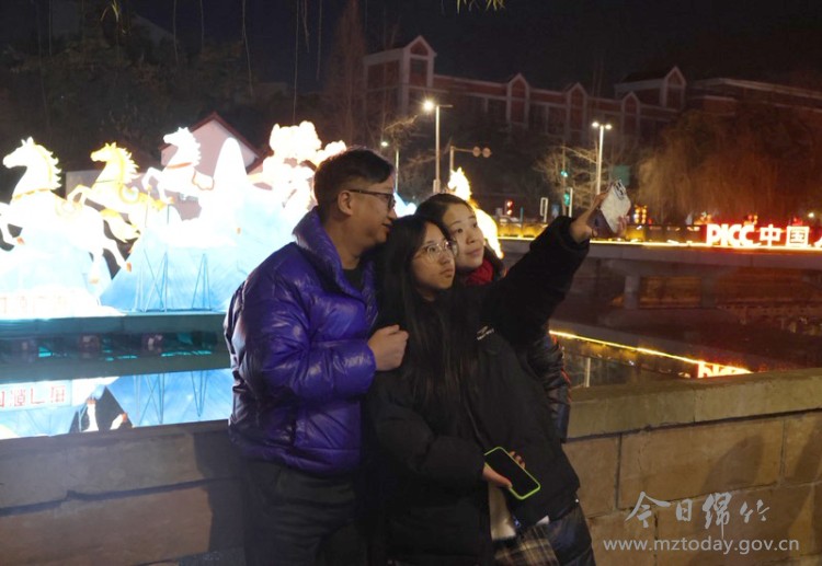 一城灯火,满街年味。春节期间,绵竹从主干道到景区景点,处处张灯结彩,洋溢着喜庆祥和的节日氛围。回澜大道、苏绵大道、绵竹广场等地被中国结、红灯笼与各色彩灯装点成流光溢彩的“光之隧道”。马尾河中,13组大型河灯迤逦绽放,将绵竹年画与现代光影科技巧妙融合,暖黄、绯红、靛蓝……各色灯光交织相融,在水中轻轻摇曳,碎成满河星子。河岸两旁,游人如织,每个人都沉浸在浓浓的新春氛围里,灯火映红了一张张笑脸。