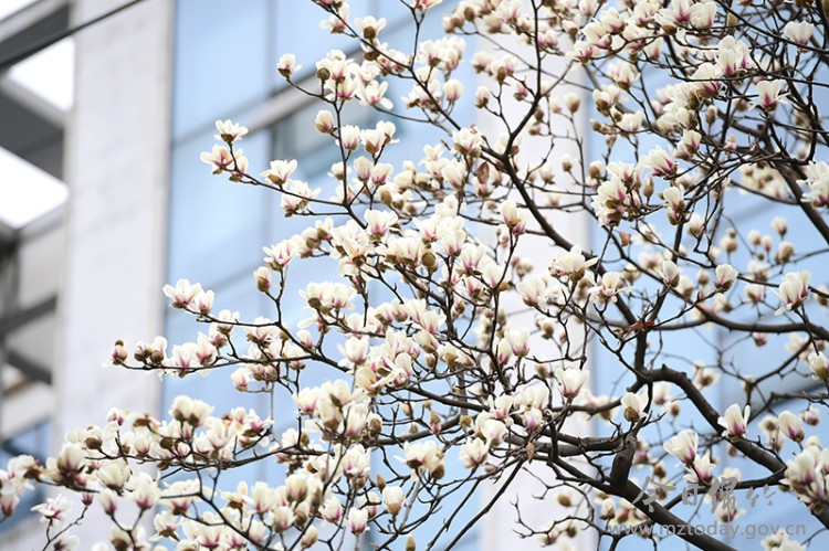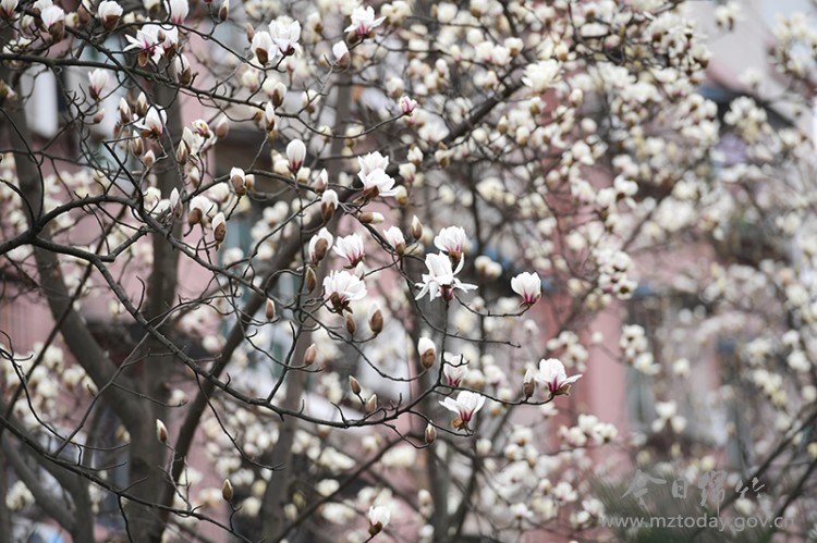 玉兰花亭亭玉立、风姿绰约,洁白与淡粉的花瓣舒展枝头,暗香浮动,吸引众多市民驻足观看。