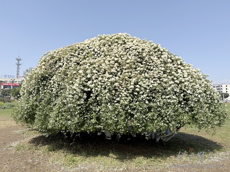 4月3日,记者来到花旁看到,这株七里香长势喜人,枝繁叶茂,洁白的小花一簇簇、一团团,密密麻麻地铺满了整个植株,从高处垂落,宛如白色瀑布倾泻而下,在春日暖阳的映照下,显得格外纯净柔美。微风轻轻拂过,花枝随风轻颤,细碎的花瓣微微晃动,香气随风飘散,让人忍不住驻足,沉醉在这限定的春日美景之中。