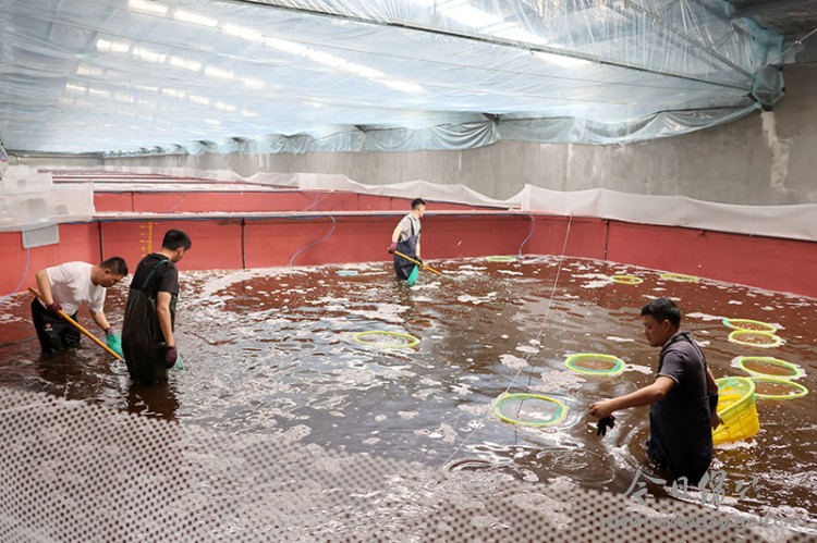 近日,位于富新镇吉兆村的通威智慧渔业养殖基地一片繁忙。随着最后一网南美白对虾被捞出、装车,发往重庆,该基地首批养殖的4万斤南美白对虾全部售罄。从去年12月中旬投苗到今年4月初丰收,这一“海鲜陆养”项目用100天左右的时间交出了内陆水产养殖的亮眼答卷。