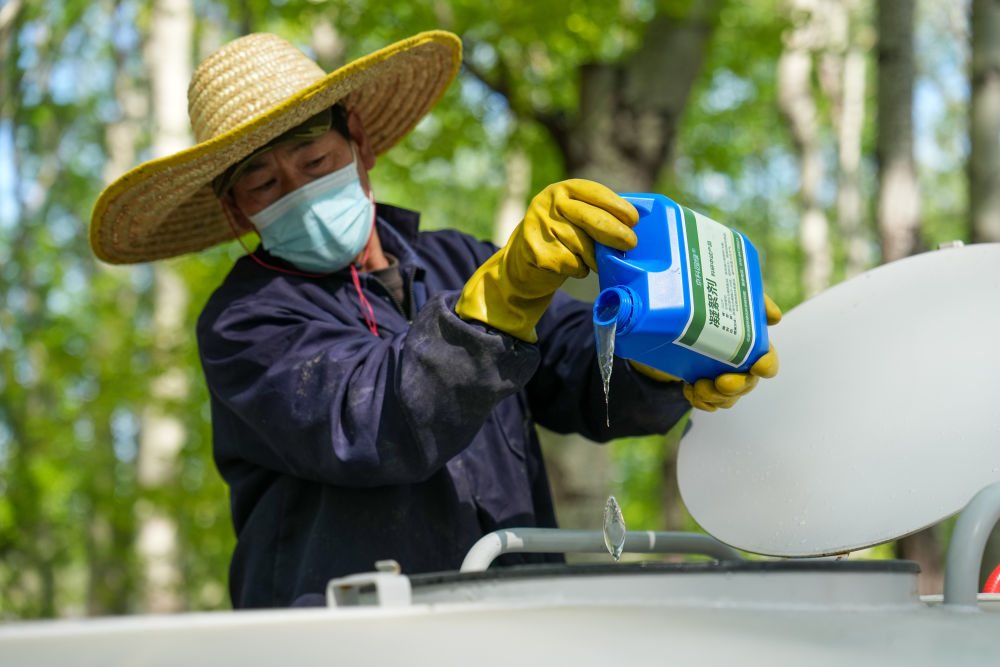 4月11日,在北京奥林匹克森林公园,工作人员在用加入了凝絮剂的水喷洒杨树。新华社记者 鞠焕宗 摄 “这是我们研发的一款改良型杨柳飞絮凝絮剂。”在现场指导作业的北京市园林绿化科学研究院教授级高级工程师王艳春告诉记者,这种高分子有机物兑水稀释后喷洒在雌株树冠上,能快速形成一层肉眼难辨的“生态膜”,让种絮黏结收缩,失去飘散的“飞行能力”。 记者了解到,改良后的凝絮剂单次喷施可使单株飞絮量减少三分之二以上,正常情况下一个飞絮季喷施一次即可。该制剂在自然条件下可降解,不影响树木生长。 喷洒有了新配方,环卫工人手里的家伙事儿也变了样。治理现场,工作人员提着一台类似吸尘器的黑色设备走过,地面堆积的白絮顺着管口被精准吸入,既没有扬尘,也没有飞絮四散。 这台设备是已全面投入使用的轻便型杨柳飞絮吸收机,整机重1.4公斤,可定向清理边角地带的积絮,消除堆积飞絮的火灾隐患。