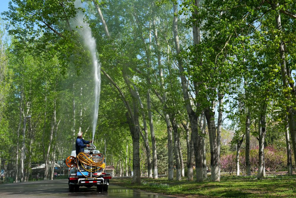 4月11日,在北京奥林匹克森林公园,一位工作人员在往洒水车内加入凝絮剂。新华社记者 鞠焕宗 摄 这些年困扰市民的飞絮,究竟从何而来? 杨树、柳树雌雄异株,飞絮来自雌株。春季雌株花序授粉后生成蒴果,成熟开裂时,白色絮毛携带种子借助风力传播,这是植物正常的生理现象。北京全市飞絮期一般从4月上旬持续至5月下旬,每日10时至16时为高发时段。 治理不等于简单砍伐。北京市园林绿化局科技处处长姜英淑说,杨柳树是北京乡土树种,生命力强、养护成本低、遮荫面积大。“杨树在北京最高可达30多米,如果完全没有杨树,北京的绿色天际线将下降10米左右。”