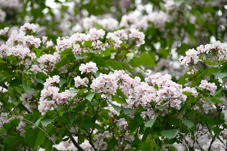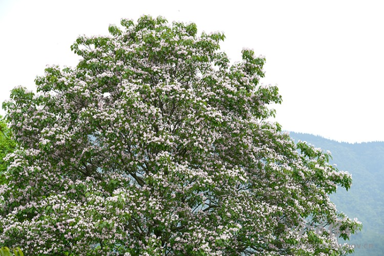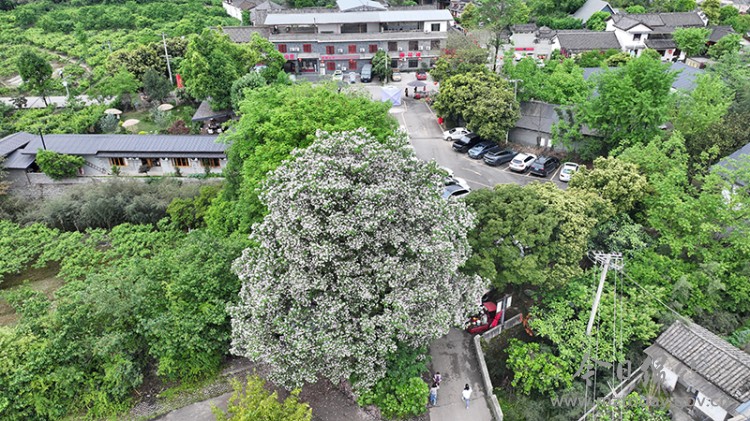 眼下,位于九龙镇棚花村李园农家乐旁边的一株高大挺拔的楸树繁花盛开,白色的花朵像喇叭一样缀满枝头,蔚为壮观,吸引了四面八方的游人前去观赏、拍照打卡。