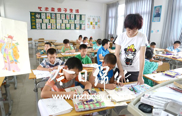 为丰富留守学生暑假生活,兴隆学校为30多名留守学生开展了为期一个月的暑假辅导班活动。活动内容包括艺术课、文化课学习,参观成都海洋馆、绵竹经济开发区企业等。此次活动得到了团市委、关工委、仁爱医院、绵竹三彩画坊等单位的大力支持。图为老师为留守学生上美术课的情景。