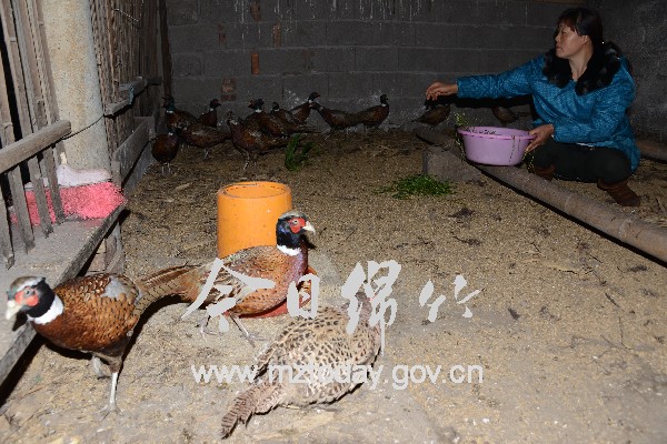 近年来,汉旺镇新开村6组养殖户周扶凤养殖七彩山鸡、茶花鸡、原鸡等近万只,年产珍禽蛋12万枚。周扶凤致富以后不忘乡邻,先后带动邻近村组50多户村民走上养殖山鸡致富路。图为周扶凤正在给七彩山鸡添饲料。 |