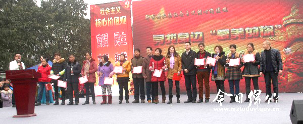 本刊消息 2月9日上午,新市镇“弘扬社会主义核心价值观、寻找身边最美的你”评选表彰暨迎新春群众文艺汇演在场镇广场举行。 据了解,为弘扬社会主义核心价值观,传递社会正能量,新市镇于2014年12月在全镇拉开了“弘扬社会主义核心价值观、寻找身边最美的你”系列活动,从大家身边评选出“爱岗敬业”、“孝老敬亲”、“勤劳致富”等先进典型人物。通过支部评选推荐、镇党委讨论审批,蔡军等14名来自各单位的职工被评为“爱岗敬业先进个人”,徐成秀等14人被评为“孝老敬亲先进个人”,魏红梅等12人被评为“勤劳致富能手”。 当天上午,来自四面八方的群众将活动现场紧紧包围,大家一边欣赏由新市镇各村群众自己编排表演的精彩歌舞节目,一边观看先进典型的宣传短片。精彩的歌舞表演赢得了现场观众的热烈掌声,而最让大家感动的是评选出的先进人物感人的事迹。 “今天的活动非常热闹,这些文艺节目都是我们新市镇群众自己表演的,感觉很亲切。最让我感动的是这些受表彰的先进人物,他们是我学习的榜样!”活动结束后,一位叫许陈的观众感慨地说道。 当天,市委宣传部、市文明办、市文体广电出版局相关负责人与新市镇党委政府负责人和数千名群众一起观看了精彩的文艺表演。