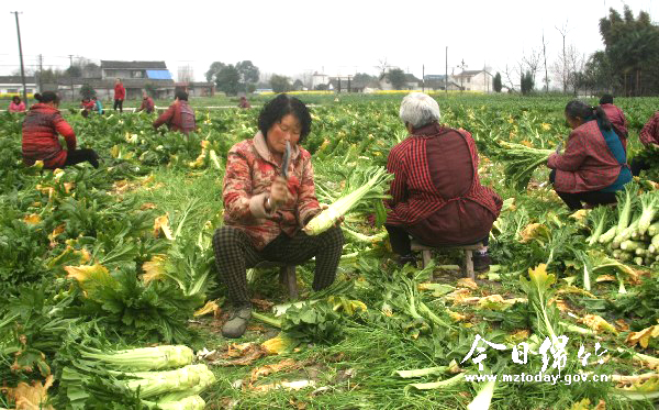 “5元钱一小时,一天能做10小时左右,每天都能挣五六十元。”共和村6组59岁的郑大琼大娘一边切剥棒菜的老叶子一边跟记者闲聊。自从2013年村里开始种蔬菜以来,村民们就多了个稳定的打工收入,种莴笋收茄子,一年四季干不完的活,挣不完的钱。干活的大都是村里六七十岁的老头老太太,年收入都能上万元。郑大娘笑眯眯地说,这些菜都是村干部们带头种的,村民们的土地有了租金,平时还能就近打工,老头老太太一年能挣一两万简直知足了。 另外一片田里,也是一大群老头老太太在收大白菜。“这些菜要拉到绵阳去,春节期间菜价比较好,绵阳蔬菜需求大,我们每天都要从这里拉几十吨菜过去。”来自绵阳的蔬菜商贩周清明说。“我们从正月初二就开始每天来地里收菜干活了,一天能挣好几十块钱呢。”68岁的李甫成大爷乐呵呵地说。 据介绍,从2013年开始,该村党支部书记、村主任、村文书等四个村干部和几个村民小组长带头租地种蔬菜,现在全村蔬菜种植面积已有1500多亩了,一年四季都有菜卖,这些菜大都卖到外地去。“种菜虽然有赚有亏,但村民们却有了长期稳固的收入,去年在亏本的情况下,村干部们贷款也将土地租金和工钱及时发放到村民手中,去年仅人工工资一项就发出去200余万元。”该村党支部书记詹元生说。 看着地里开心忙碌的村民们,詹元生笑着说,作为村干部,要得到村民们的拥护,必须得付出心血,帮他们实实在在做些事。“村里有土地,就在土地上想办法,让大家走出传统农业,挣到钱。”詹元生告诉记者,他从2004年开始担任什地镇共和村党支部书记以来,一直想方设法摸索农村致富门路,他种过蘑菇,养过鸡和猪,还经营过机械,现在又承包土地种蔬菜,总之就是尝试各种办法带领村民们一起赚钱。如今,村里每天都有一百多人种菜卖菜,有时人手不够还得从齐天、富新等邻近镇村请人。村民们在菜地里打工挣到了钱就开心,村里矛盾也少了,大家都齐心合力发展生产奔富路。