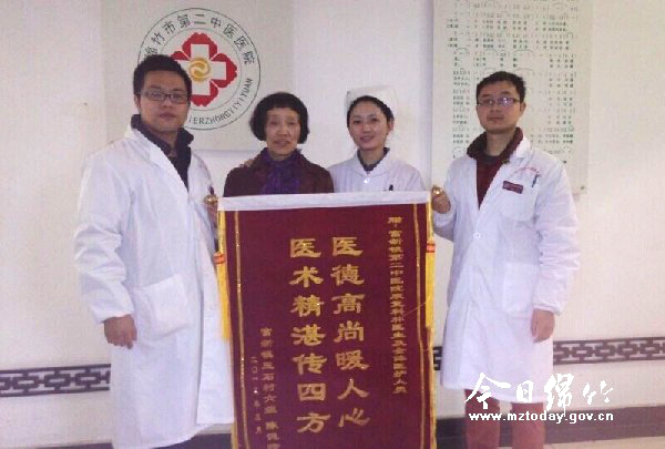 本刊消息 3月23日,家住富新场镇的陈德珍老人将一面写着“医术精湛传四方,医德高尚暖人心”的锦旗送到第二中医医院针刀康复科林仞医生的手中,以感谢林医生对自己的贴心服务。 今年1月22日,陈德珍因食道癌术后身体不适到第二中医医院针刀康复科住院治疗。在科室医护人员的精心治疗和细心照顾下,老人病情日渐好转,身体恢复迅速。老人出院后,林仞医生还定期打电话询问她的身体情况,并指导其口服用药,叮嘱其定期回院复查。每当陈德珍老人拿着化验结果来科室询问的时候,医护人员总是热情接待,耐心解释,令老人很感动。为此,老人专门制作了一面锦旗送给林仞医生等医务人员表示感谢。