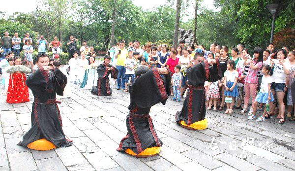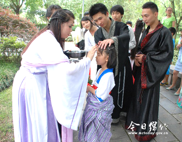复古的汉服,抑扬顿挫的祭文诵吟,让人仿佛回到古代。6月20日是传统的端午佳节,当天30余名“绵竹汉服”QQ群成员在苏绵公园里举行端午祭祀活动。除了传统的祭祀仪式,还举行了点雄黄酒、斗草、斗蛋、刺五毒、做长命缕等传统文化活动,让市民大饱眼福,过了一个别样的端午节。 祭祀仪式 让市民领略传统文化魅力 上午10点,苏绵公园一角,30余名身着汉服的“绵竹汉服”QQ群成员聚集在一起,互称同袍,为举行屈原祭祀准备着。曲裾、高腰襦裙、圆领袍衫……她们身穿五颜六色的汉服,各具风情,美不胜收。 10点半,一位身着汉服的同袍双手抚琴,弹着《高山流水》曲子,祭祀仪式正式开始。身着华丽长袍的初献官、亚献官和终献官上前,在盥洗位洗手后,由执事把香和酒捧给献官,按顺序依次上前献上香和酒,并进行跪拜,期间还吟诵了祭文。其他身着各式汉服的成员也整齐地列队站在一边,随着口令或是作揖,或是行礼,整齐划一。 迎神、饮福受胙、送神等仪式一一进行,礼成后,主祭开始向参祭者身上洒“艾叶水”,并赠上一条条“长命缕”。据传,“沐浴兰汤、系长命缕”的祭祀环节,意为驱邪避瘟,祈福长寿。庄重的祭祀仪式吸引了不少市民驻足观看,大家纷纷惊叹回到了古代。 据本次活动的组织者刘子钰介绍,祭祀仪式的所有流程都是根据《礼记》和《大明会典》等古籍中对端午祭祀的记载而进行的,尽可能地使参与者和市民都能感受到原汁原味的传统文化。 传统习俗 让端午节别有一番韵味 庄重的祭祀仪式结束后,按照传统习俗,还举行了点雄黄酒、斗草、斗蛋、刺五毒、做长命缕等传统文化习俗活动。一群身着汉服的“绵竹汉服”QQ群成员排成一列,一位身着汉服的长者,用手蘸取雄黄,在他们的额间点上一个图案,以驱邪避瘟,祈求健康。 斗草、斗蛋、刺五毒、做长命缕等民俗游戏则引起了全体参与者和市民的互动。“斗蛋”时,每人手握一个咸鸭蛋,用蛋相互碰撞,蛋壳破裂者为输。“刺五毒”则是在纸上分别画上蝎子、蛇、蜈蚣、蟾蜍、蜘蛛,用针刺以驱除虫害。每项比赛进行时,都吸引了不少市民围观,也有不少市民纷纷加入游戏中。“从来没玩过这些游戏,太有意思了,通过这种传统方式过端午节更有意义。”市民易雪梅说。 据刘子钰介绍,举办端午节祭祀活动主要是为了让更多的人关注传统文化,通过衣冠来唤醒人们对传统礼仪的关注。除端午节外,在其他传统节日里,他们也会身穿汉服自发组织活动,依循古礼,向市民宣传推广中华传统文化。 据悉,“绵竹汉服”QQ群创建于2013年,当时仅有5名成员,目前已有成员300余名,这些人来自各行各业,有学生、老师、公务员、企业员工,还有退休老人,平时主要靠网络交流汉服知识和传统文化。