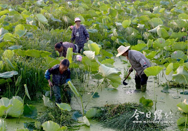 7月19日早上,九龙镇新龙村的村民正在荷塘里除草。为营造更加优美的环境,该荷塘业主组织当地农户对上百亩荷塘除去杂草,以便游人前去观赏盛开的荷花。 |