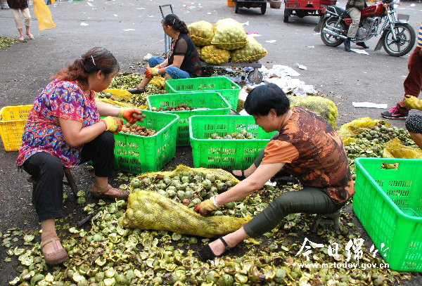目前正是新鲜核桃销售的旺季,记者走访市场发现,随着中秋节的临近,新鲜核桃被市民视为馈赠亲友的佳品,而青皮核桃因为价格低廉更受市民青睐。 9月15日,记者在南轩水果市场看到,一车车青皮核桃刚运到市场内,批发商便忙着卸货、抬货,核桃贩子也早守在一旁等候装车。不少市民也专程赶来选购,种类繁多、物美价廉的青皮核桃一路走俏。 市民彭丹在市场里转悠了一圈,花两百元买了一大袋青皮核桃。“青皮核桃新鲜,可以边吃边剥皮,存放时间长一些。”彭丹说,她买的新疆核桃个大皮薄又香甜,每斤售价才4元不到,比街上摊贩卖的剥了皮的核桃划算多了,最贵时她买过20元一斤的。 核桃批发商李飞告诉记者,近期市场上的青皮核桃主要来自广元、绵阳、新疆、陕西等地,基本上一车30吨的青皮核桃两三天就能卖完,他每天光零售剥了皮的核桃就能卖出几千斤,大家图的就是一个“新鲜”。 为了满足市民购买的需求,批发商们还招了一批工人来对青皮核桃剥皮加工,每人每斤5毛钱,最高一人每天可挣150元。记者发现,场面壮观的剥皮队伍也成了吸引顾客的活广告。“走进市场就看到他们在这里剥核桃,一看就新鲜得很,价格还比街上的便宜。”市民李梅一边询价一边挑选说。 据了解,中秋节后市面上的新鲜核桃便会逐渐减少,喜欢吃新鲜核桃的市民要抓紧时间了。