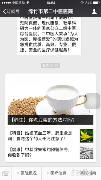 本刊消息 “每天都能收到医院发布的养生知识以及各种贴心小卫士,这让我在平常的生活中更加注重饮食习惯,真是太好了!”日前,记者走进市第二中医医院采访时了解到,自去年12月中旬,该院正式开通医院官方微信平台以来,吸引了不少病患和市民关注,平台及时发布的消息和丰富的内容更是受到了关注者连连称赞。 据平台负责人介绍,该院充分利用微信公众平台及时、方便、互动的特性,将该微信公众号打造成全方位展示医院形象、发布新闻资讯及各种健康小知识展示的平台,为医生与患者,与市民搭建起交流沟通的渠道。目前,该院微信公众号开通了医院概况、医疗信息、就医指南等内容,广大微信用户可通过查找公众号“市第二中医医院”进行关注。 据了解,自市第二中医医院开通微信公众号以来,短短3个月时间内,点击关注的用户已达千余人。接下来,该院还将借助微信公众平台,进一步提升医院服务水平和医生业务素养,让病患享受到更好的医疗服务。