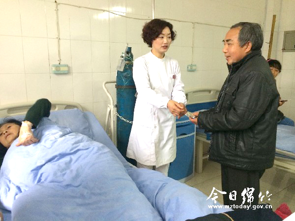 本刊消息 “真是太感谢您们了,给您们添麻烦了!”3月24日上午,市第二中医医院病房内上演了温情一幕。该院支部副书记易安蓉将全院职工捐助的爱心款交到贫困患者彭凤英丈夫手中时,面对突如其来的温暖,这位淳朴的农村老汉一个劲地点头致谢。 据了解,今年55岁的彭凤英是我市兴隆镇灵桥村人。前不久查出患子宫内膜癌晚期,于3月21日入住该院外科接受治疗。由于丈夫患前列腺癌一直接受化疗,高昂的费用使原本不富裕的家庭不堪重负,如今妻子又身患癌症,巨额的医疗费对这个家庭来讲无疑是雪上加霜。该院得知情况后,不仅为其减免了部份医疗费用,还在全院发起爱心募捐活动,总共募集到2550余元送到了彭凤英的手中。