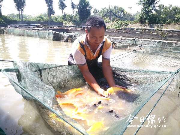 图为养殖户江兵正在对鱼进行分类放养