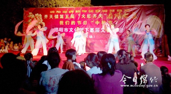 本刊消息 9月8日晚,在第五届“火红齐天”文化活动中,德阳市文化馆专程为该镇群众进行文艺演出,丰富多彩的节目吸引了上千名群众前来观看。 据了解,齐天镇是德阳市文化馆开展现代公共文化服务“结对子种文化”的文化服务,为了更好地为老百姓服务,德阳市文化馆还为齐天镇授予“结对子种文化”乡镇文化服务基地。当天的演出中,演员们表演的舞蹈《酒香画城德阳美》、《祝福》以及街舞、爵士舞等文艺节目,极大地丰富了基层群众艺术文化生活。