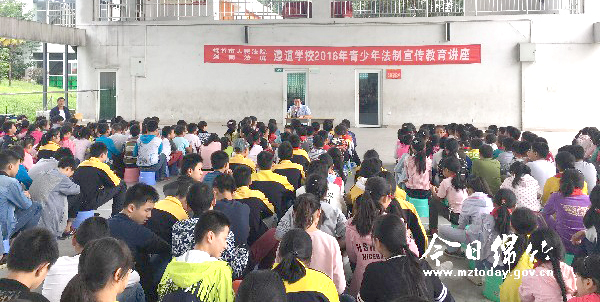 本刊消息 为增强全体师生的法制意识,增长安全知识,提高师生的安全防范意识和自我保护能力,9月23日下午,遵道镇关工委、遵道学校开展了法制宣传教育讲座,特聘请了绵竹市人民法院剑南法庭肖洪峰法官到校做法制专题辅导报告。遵道学校4-9年级400余名学生参加了这一活动。 当天,肖法官主要针对部分学生性格急躁、自控能力较弱、法制观念淡薄等不良现象,用生动的案例、深刻的教训,警示学生要遵纪守法,不要做让个人后悔、家庭蒙羞、社会不安的糊涂事情,教育大家要充分认识上网、吸烟、下河洗澡、打架斗殴的严重危害,正确处理好各种关系,充分珍惜大好的学习时光,以真才实学回报家长和社会。 精彩、生动的讲座,赢得了师生们的热烈掌声,使大家对法律有了更新、更深的认识。同学们纷纷表示,决心做一个学法、知法、懂法、守法、护法的好学生、好公民。
