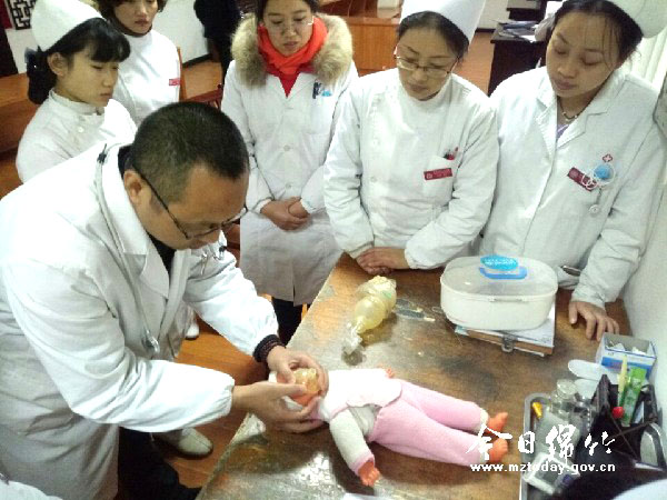 本刊消息 为进一步提高新生儿窒息复苏的应急抢救能力,日前,市第二中医医院组织开展了新生儿窒息复苏与技能操作专题培训。 培训期间,该院新生儿科医师马军就新生儿窒息的症状、诊断要点等做了详细讲解,并从新生儿窒息复苏方法、窒息复苏气囊和面罩使用技巧等方面行了集中辅导和现场答疑。随后,培训人员还分组对新生儿复苏气囊使用、气管插管、胸外心脏按压等复苏技术进行现场操作培训。