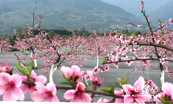 “满树和娇烂漫红,万枝丹彩灼春融。何当结作千年实,将示人间造化工。”走进桃林,一片桃花争艳春色满园的美景便映入眼帘,一朵朵桃花就像是薄施粉黛的姑娘站立枝头,渴望展示自己的美丽,却又略带几分羞涩。一阵微风吹来,朵朵桃花就像一只只花蝴蝶,扑打着翅膀,翩翩起舞,叫人目不暇接,神迷意醉。 “这里一共栽植了6000多株桃树,每年赏花最好的时节是3月中旬到4月中旬。”龙腾农业公司技术管理员告诉记者,这片桃林栽种于2015年,共有300余亩,4个品种。为了让广大游客更好地观光、赏花,园区还嫁接了一些专门用来赏花的桃树,花期也会更长,而这段时间便是赏花的最佳时期。 汉旺新开村的这片桃林依山傍水,地势特别,环境清幽,踏进桃园便给人一种步入了世外桃源的感觉。在被广泛宣传后,成为绵竹又一赏花胜地。而对于管理员老蒲来说,“人气太旺、步行路被车辆压坏”则成为他的一大烦恼。“为了防止游客把车开进桃园,我们在清明小长假期间专门派了工作人员在桃园入口处告知广大游人将车辆停于园外,但仍然有不少游人直接将车开进桃园,对桃园内的人行道破坏很大。”老蒲坦言,现在喜欢这里的人越来越多,园区还将从6月中下旬开始举行鲜桃采摘活动,他真诚地希望来这里观光休闲的人们能珍惜这里的美,用实际行动维护这里的美。