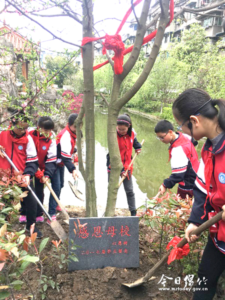 4月5日下午,天河小学组织开展了以“师恩润根 母校情长”为主题的毕业植树活动。在温暖的阳光中,2017届毕业班学生、家长及老师代表齐聚天河小学水景区,亲手种下一棵代表着对学校感恩与眷恋的黄果树。 |