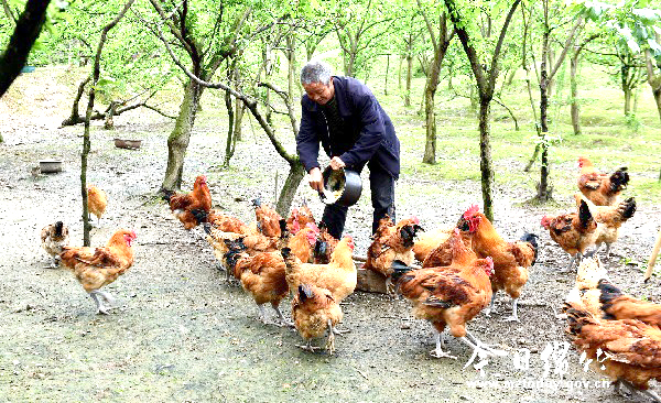土门镇麓棠村10组农户钟孝明在沿山承包土地种植梨树等水果150亩,并在梨树下套种茶树,在李树下养鸡,不仅自家致了富,还带动附近村民实现了增收。图为钟孝明在给土鸡喂食。