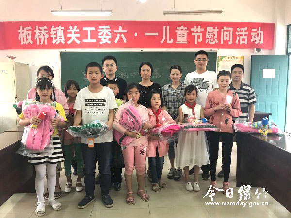 板桥镇:“六一”国际儿童节到来之际,5月26日,板桥镇青年机关干部和关工委带着全镇干部职工的爱心捐款看望慰问了板桥学校15名贫困留守儿童,为孩子们送去了图书、文具、水杯等慰问品,送去了党和政府的关爱与祝福。 本刊记者 申梨/摄