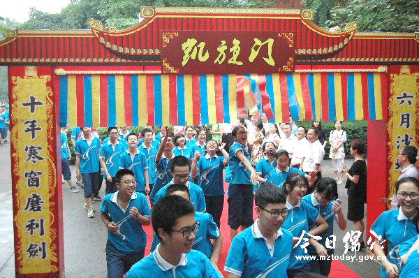 6月10日,绵竹实验学校举行2017届毕业典礼,为该校670名初三学生参加中考壮行。学生们跨过“凯旋门”,家长代表和初三教师、行政人员列于两侧热烈欢迎,掌声中充满祝福与期盼,学生代表演唱了歌曲《我相信》,校学生会主席带领全体初三学生作了毕业宣言。 |