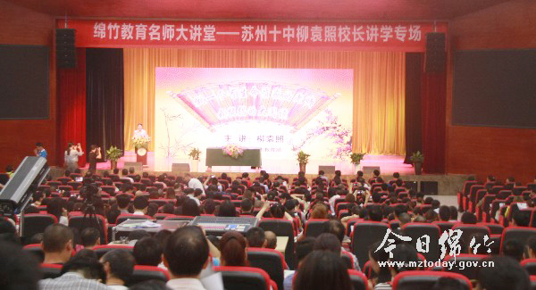 本刊消息 6月16日,由市教育局主办的第十期绵竹教育名师大讲堂在天一学院开讲。市教育局机关干部、全市所有学校的行政干部以及各级各类学校学科教师代表共计千余人参加培训。 当天,苏州十中校长、教育部华师大中学培训中心兼职教授、苏州大学教育学院硕士生导师、苏州中小学教育管理学会副理事长兼秘书长柳袁照以《做一个有生命质感的老师——我提倡的“大阅读”》为题,对与会人员作了培训。在两个小时的讲座中,柳袁照以范仲淹的《岳阳楼记》、王安石的《游褒禅山记》、苏轼的《赤壁赋》为例,用幽默风趣的语言、广博的知识和传统经典故事,剖析了名人经典著作,阐述了对“大阅读”的独到见解,充分展示了中国的语言之美、智慧之美、文化之美,让大家深受启迪,受益匪浅。 培训结束后,学员们纷纷表示,他们将认真总结吸收学到的新知识,将其运用到今后的教学中,为我市的教育事业作出新的贡献。据了解,此次培训结束后,各学校将分别组织教师展开深入的讨论、内化,并形成文字资料统一交至市教师培训中心,让“大讲堂”起到更好的效果。