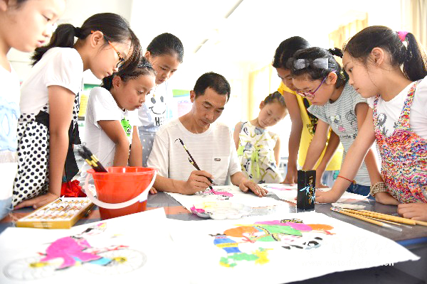 从7月10日开始,兴隆学校开展了为期一个月的“大手拉小手·快乐暑期班”活动。该镇的留守儿童、精准扶贫及地震再生育家庭孩子等50多名学生参加了年画、书法、音乐、体育、英语以及阅读与写作的培训学习。图为绵竹市级非物质文化遗产传承人李明生为孩子们辅导绵竹年画如何填色。