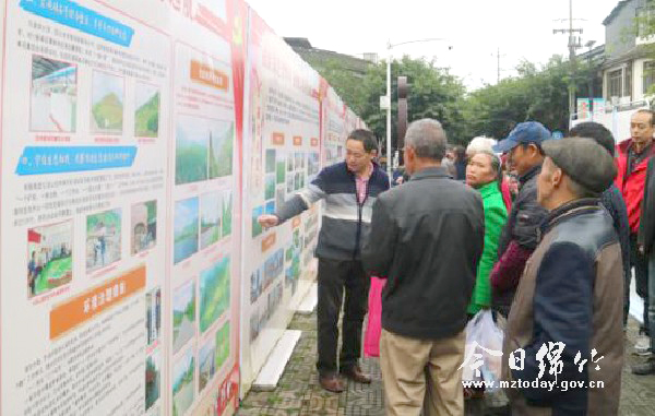 11月16日,遵道镇开展了十八大以来工作成果展、12340宣传等活动。图为该镇党委书记何俊向群众讲解绵竹市以及遵道镇十八大以来工作成果展内容。