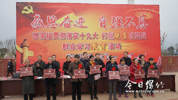 本刊消息 日前,西南镇党委、政府在金隆村理学法治文化广场开展了以“感恩奋进 自强不息”为主题的“贯彻落实十九大,打赢脱贫攻坚战”群众学习教育活动。 据了解,为进一步激发贫困群众内生动力,发挥先进的示范引领作用,西南镇开展了此次教育活动。活动坚持扶贫与扶志、扶智相结合,通过“感恩奋进,自强不息”群众学习教育,培养贫困户从“要我脱贫”到“我要脱贫”的思想转变。 市级帮扶部门、全体帮扶干部、全体“五个一”帮扶力量、全体村组干部、全镇所有建档立卡贫困户(因重病、重残行动不便的除外)共计300余人参加了当天的活动,规模大,效果好,让全镇的贫困户受到了一次深刻的教育。活动对镇上评选出的35户“勤劳致富之星”、“创业脱贫之星”、“环境整洁之星”、“感恩励志之星”进行了表彰。 “我叫陈有木,西南镇红明村5组村民,今天我在这里发言,感到很激动。我家里困难,是各级政府、社会各界给予我帮助,帮扶干部联系爱心企业解决女儿读大学的费用,缓解了家庭压力,现在自己发展养殖,贴补家用,生活也一天天好起来。我们家能有今天,全靠党的好政策,干部的帮扶……”当天,陈有木代表评选出的“创业脱贫之星”进行发言。 图强村五组袁廷华被评为“勤劳致富之星”,他说,要脱贫,关键还是要靠自身,内因才是最重要的。受到表彰的李玉生说,贫困户不能有思想包袱,要对未来充满信心,要对斩断“穷根”下定决心,要有勤劳苦干的毅力,才能改变贫困的现状。 榜样现身说法,身边事感化身边人。当天的活动,让大家深受教育,对身边典型事例进行广泛宣传,营造了浓厚的脱贫致富奔康氛围。该镇党委书记古华修告诉记者,镇上通过对典型进行大张旗鼓的表彰,教育和引导激励贫困户在脱贫致富路上,脱离“等、靠、要”的思想,牢固树立一颗自强感恩的心,争取早日脱贫奔小康,下一步,镇上将集中帮扶力量,持续开展教育活动,塑造文明新风。