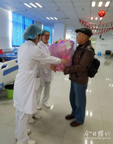 本刊消息 美丽女人节,情暖三月天。在“三八”节来临前夕,3月7日中午,华西绵竹医院血透室出现了温情一幕。 当天中午,一位手捧鲜花的患者走进血透室,看到科室的护士就立即双手捧出鲜花,真诚地说:“老师,你们辛苦了。明天是你们的节日,我提前祝你们节日快乐!” 原来,送花的这名患者名叫何先华(化名)。去年因肾功能衰竭到该院血透室进行透析。当天做完血透后,何大哥考虑到次日是三八妇女节,就赶忙买了一束鲜花送给了科室的护士们。“这些护士待我们就像亲人一样,明天是她们的节日,我只能送一束花表达我的感激之情。”何大哥说。自从患病开始在医院透析后,他就感受到了科室的温暖,“我的血管条件不太好,每次透析的时候,护士都小心翼翼地为我穿刺,帮我按摩,对我十分关心,我很感谢她们。” 走进该院血透室,31张病床上住满了正在透析的病人。科室的护士们穿梭在各个病床之间,一边检查着机器的运转,一边和病人们聊天打趣。据了解,目前科室一共有154名透析病员,护患比严重不足。为了让病患们得到全面的医护照顾,科室医护人员克服重重困难,以科室为家,不仅提前了每天的上班时间,更是加班加点,牺牲休息时间为患者服务,得到了患者的一致好评。 护士杨小红说,透析病人都需要长期到医院透析,很多病人都和科室医护人员建立了深厚的感情,“我们之间就像亲人一样无话不说,有些病人家里闹矛盾,我们也要帮着劝解,就是希望他们能够开开心心地生活下去。”