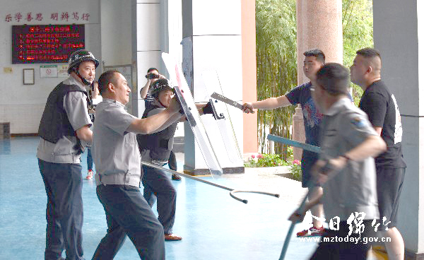 5月23日下午,绵竹实验学校模拟了两名暴恐分子突袭校园,该校校警和防暴恐应急小组老师如何快速组织学生撤离应对、科学处置的场景。活动开始前,市公安局特警大队民警对学校的安保人员进行了警械使用讲解和示范。