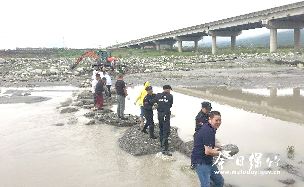 本刊消息 6月8日,汉旺镇组织机关干部、网格员、综治巡逻队员及牛鼻村、群力社区工作人员、民兵等60余人在绵远河汉旺段举行了2018年度防汛应急抢险演练。 本次演练模拟的险情是绵远河突发山洪,导致汉旺镇绵远河大桥下方左侧河堤冲毁(牛鼻村3组)80米,使牛鼻村临河住户的房屋及货运大道造成威胁,影响牛鼻村村民生命和财产安全,由于维修方案正在制定中,急需对该段河堤应急处置。汉旺镇党委政府接到险情报告后,第一时间启动应急响应,调动应急抢险队伍和抢险物资,大家针对汉旺镇牛鼻子大桥下方左侧水毁堤防应急处置修复工程加固河堤80米,叠加装满两层铅丝笼临时加固,空隙部分用砂石填充。记者在现场看到,参与演练的工作人员在工程处置前先在河道中挖沟开槽,阻断水流,改变水流位置。摆放好铅丝笼之后,大家采用人工运输的方式,往铅丝笼中填充石头,最终经过2个多小时的奋战,共填充铅丝笼10余个,达到了临时加固的目的。