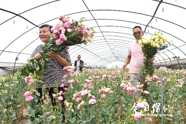 本刊消息 6月19日,在什地镇双瓦村,绵竹市绿鑫种植专业合作社社员正在采摘30亩大棚内的鲜切花洋桔梗花。 当地在2012年从云南引进这种鲜切花试种,经过6年的摸索,该合作社基本掌握其种植、管理技术要领。眼下,这些绿色、紫边、粉红、白色、香槟等色彩的洋桔梗花争相绽放,农户把这些鲜切花采摘后整体打包销往成都的花卉批发市场,发往全国各地。 据介绍,这种花卉在四川十分不易成活。该合作社种植的洋桔梗每束花(10朵)在批发市场销售价为30元。 据悉,洋桔梗又名草原龙胆,原生于美国西部至墨西哥之间的石灰岩地带,现代的洋桔梗栽培是在日本兴旺起来的。在21世纪60年代已开始作商业化的栽培。洋桔梗花色典雅明快,花形别致可爱,颜值都是逆天级、妖孽级的,是国际上十分流行的盆花和切花种类之一。洋桔梗株态典雅,色调清新淡雅,耐久性好、观赏期长,用于点缀居室、阳台或窗台,呈现出清新高雅之感。若剪下几支紫色洋桔梗,配上白色的百合花,用于插花十分得体。