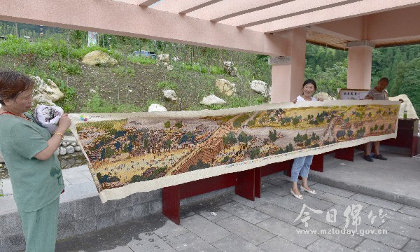 6月30日,金花镇三江村妇女熊晓凤(中)在该村的文化广场走廊展示她绣制的《清明上河图》十字绣。该十字绣作品长约700厘米、高约60厘米。她告诉记者,以前她在绣鞋垫,这次用了两年时间绣成《清明上河图》。