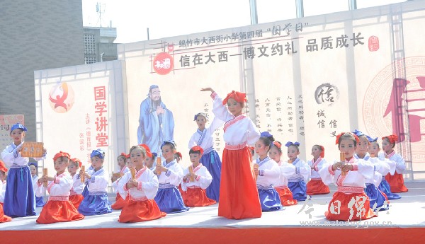 本刊消息 为弘扬中华传统文化,增进师生的国学体验,9月28日,大西街小学开展了以“信在大西——博文约礼 品质成长”为主题的第四届“国学日”系列活动。 在师生祭孔、童蒙启智现场,全校师生代表在司仪的带领下向孔子鞠躬、上香。紧接着随着主持人的“正衣冠、尊长到位、朱砂起智”话音落下,受邀嘉宾们拿起手上的毛笔轻蘸朱砂,在一年级新生的额头上轻点红“痣”,随后,接受朱砂点痣的学生们依步骤检查自己的衣着,向老师三鞠躬行拜师礼,以从小养成对老师、对知识的敬重。 当天,精彩的国学活动分为写信、诵信、舞信、讲信、唱信等多个部分。伴随着悠远的古筝乐声,高年级学生组成的书写队伍,在国学老师的带领下,一笔一划地书写起“信”字。在诵信环节,孩子们对有关“信”的古文进行了诵读,并通过舞蹈、歌唱、快板等方式,向在场师生、嘉宾讲述、传播了中华传统文化和传统经典故事。整场活动精彩纷呈,令学生及家长感受颇深。大西街小学学生赵芯涵笑着告诉记者,能够参加“国学日”活动非常开心,不仅了解到孔子生活经历和学习,还感悟到了“信”的含义。 据了解,为激发孩子们强烈的民族自豪感和家国情怀,建立起正确的诚信观,让中华诚信薪火相传,活动当日,大西街小学特邀中国《德育报》社长、总编辑张国宏老师在该校的国学大讲堂中,开坛论道,播种诚信,以“美从口出”劝勉师生,写意国学大美。