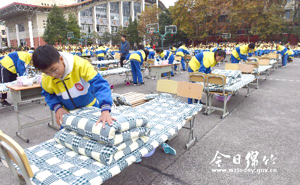 本刊消息 11月6日下午,绵竹中学初中部2018年内务规范化比赛在学校运动场举行。当天,来自该校初一、初二年级的48位选手,在8分钟内进行了整理床单、折叠被子、摆放床下鞋子、盆子和桌子上的牙膏牙刷及漱口杯等寝室内务比赛。经过激烈角逐,10名学生获得生活自理小能手奖。 据悉,从2009年开始,该校连年举行内务规范化比赛,以促进学生生活自理能力的提升。每年新生入学后,学校会集中开展内务整理培训,开学后一个月内,生活老师深入各寝室逐一指导学生进行规范化内务整理,并将内务整理情况列入各班、各年级的考核。