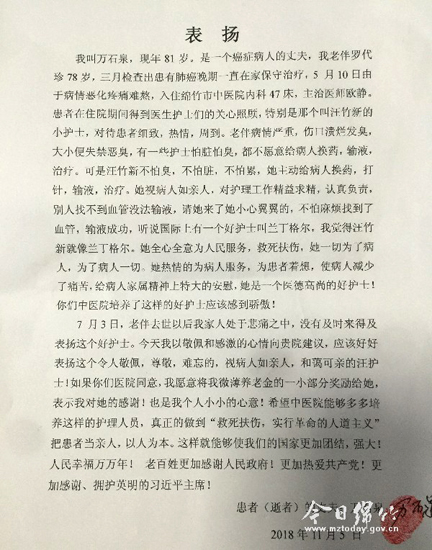 本刊消息 “听说国际上有一个好护士叫南丁格尔,我觉得汪竹芯就像南丁格尔。她不怕脏,不怕累,不怕臭,视病人如亲人……是一个医德高尚的好护士。”近日,一封满含患者家属感激之情的信件,送到了市中医医院内科/中医肿瘤科,科室医护人员看着这满含真情的信纸,心里充满了暖意和感动。 记者了解到,万石泉的老伴罗代珍今年3月被查出患有晚期肺癌,一直在家进行保守治疗。5月份,因病情恶化来到市中医医院进行治疗。住院期间,老人因病情严重,加上长期卧床、大小便失禁,发生了压疮并溃烂发臭。而汪竹芯护士不仅耐心、主动地为她换药,还经常与他们老两口沟通,安慰、鼓励他们要积极配合治疗。她的细心、周到以及专业的工作态度,让老两口感到非常暖心。 7月初,罗代珍因病重去世,全家人都陷入了悲痛之中。但每每想起这位暖心的护士,万石泉老人心里都觉得很安慰。在处理完丧事后,老人特意送来了表扬信,同时希望将自己的一小部分养老金作为奖励赠予汪竹芯,以表自己的感激之情。 汪竹芯接过这封饱含真情实意的感谢信,作为护士的自豪感油然而生。“面对晚期肿瘤患者,作为医护人员,我们能做的已经很少,只希望他们在最后的时间里,能少受痛苦,尽可能舒服一点,体面一点,同时,也给予患者家属精神上多一点安慰。”汪竹芯表示,她将和同事们继续用仁爱仁心仁术,守护绵竹百姓的安康。