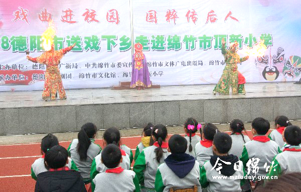 本刊消息 11月27日,位于富新镇的顶新小学内一片欢声笑语,由德阳市文广新局、绵竹市委宣传部、市文体广局、市教育局主办,德阳市川剧团和绵竹市文化馆承办的“2018德阳市送戏下乡”正在这里倾情上演。《人间好》、《柜中缘》、《忆江南》、《变脸吐火》……来自德阳市川剧团演员们精彩的表演让全校数百名师生感受到传统川剧的独特魅力。 为了让学生们更深入地了解传统川剧,当天的演出中,主持人不仅邀请学生上台与表演者一起感受川剧的表演形式,还专门将川剧表演中幕后的鼓师们请到前台表演,并向大家介绍了每一种吹打乐器在演出中的作用,让学生们对川剧艺术有了全新的认识。 顶新学校六年级一班学生陈鑫华兴奋地告诉记者,他最喜欢川剧中的变脸吐火,以前都是远远地看演员在台上表演,这次表演者走到了他跟前变脸,让他更觉川剧绝技的神秘。他表示,诙谐幽默的川剧非常好看,应该不断传承下去,如果以后有机会,他很想跟老师学习这门传统艺术。 德阳川剧团副团长刘建之告诉记者,为了响应党中央戏曲进校园精神,德阳市川剧团从2016年就展开了送戏下乡和川剧进校园活动,近三年时间他们走遍了旌阳区各学校,并挑选培养了一大批川剧苗子,现在又扩展到德阳各县市区的学校。为了让学生们看懂川剧,他们专门挑选了剧情简单、具有观赏性的正能量剧目,希望让学生们更加了解并热爱川剧,让这门传统戏曲艺术代代传承下去。
