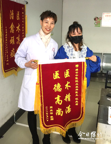 本刊消息 12月17日,德阳市旌阳区患者周怡(化名)将一面印有“医术精湛 医德高尚”的锦旗送到了市中医医院皮肤科主任汪兆君手中,以表达自己的感谢之意。 据了解,患者周怡10多年前右小腿出现红斑、丘疹,瘙痒难耐,后被医院诊断为“慢性湿疹”。多年来,周怡辗转多个医院反复治疗,症状不仅没有缓解,斑块还不断增大增厚,她和家人为此十分着急。 两个月前,通过朋友的介绍,周怡来到市中医医院皮肤科就诊。汪兆君对她的病情及治疗过程进行了仔细了解后,根据她的实际情况制定了详细的治疗方案,通过一段时间的精心治疗,周怡瘙痒症状得到明显缓解,目前已经痊愈。 困扰多年的皮肤病终于治愈,为了表达对汪医生的感激之情,周怡特意从德阳市赶来,将这面鲜红的锦旗送到了汪兆君医生的手中。(图由市中医医院宣传科提供)